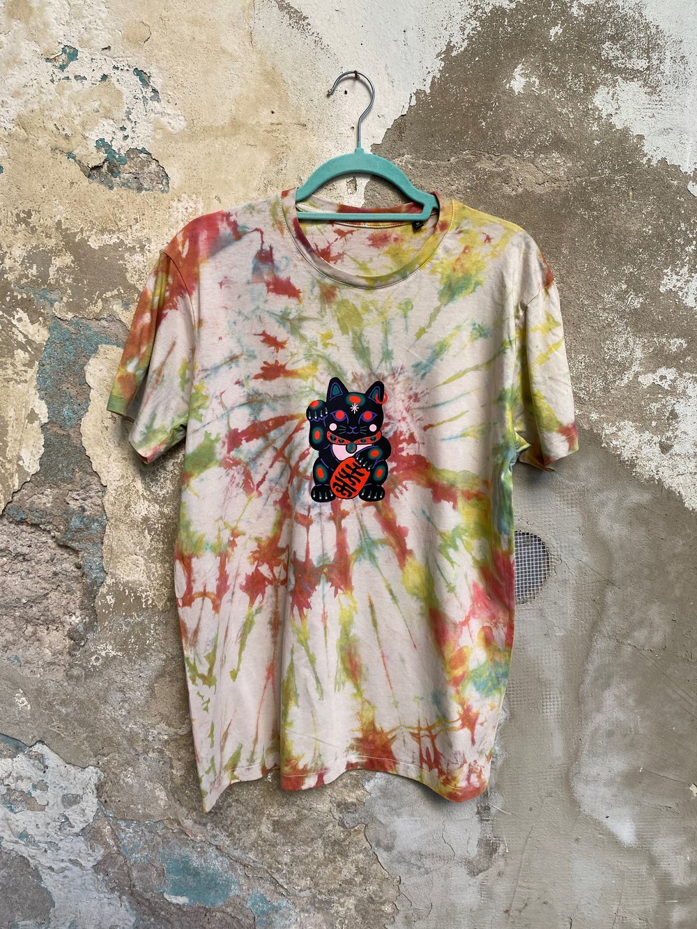 Tie-dyed shirts straight from my kitchen with a digital print of the maneki neko cat.